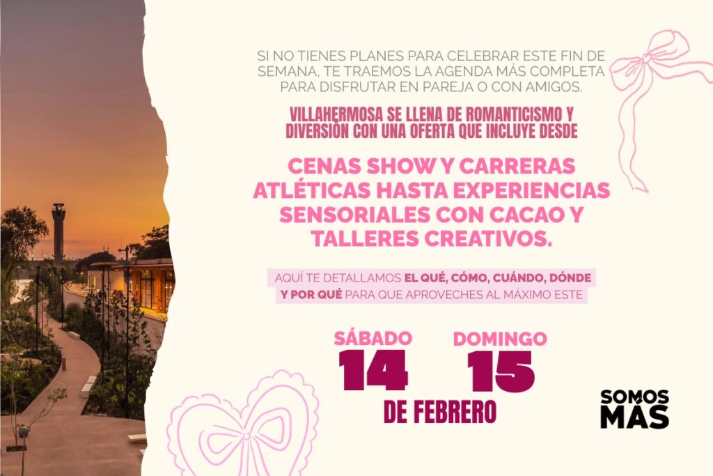 Si no tienes planes para celebrar este fin de semana, te traemos la agenda más completa para disfrutar en pareja o con amigos. Villahermosa se llena de romanticismo y diversión con una oferta que incluye desde cenas show y carreras atléticas hasta experiencias sensoriales con cacao y talleres creativos. Aquí te explicamos el qué, cómo, cuándo, dónde y por qué para que no te pierdas nada de lo que sucede este sábado 14 y domingo 15 de febrero.