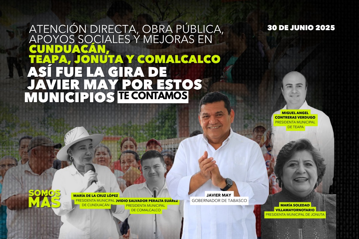 Atención directa, obra pública, apoyos sociales y mejoras en Comalcalco, Cunduacán, Teapa y Jonuta. Así fue la gira de Javier May por estos municipios. Te contamos