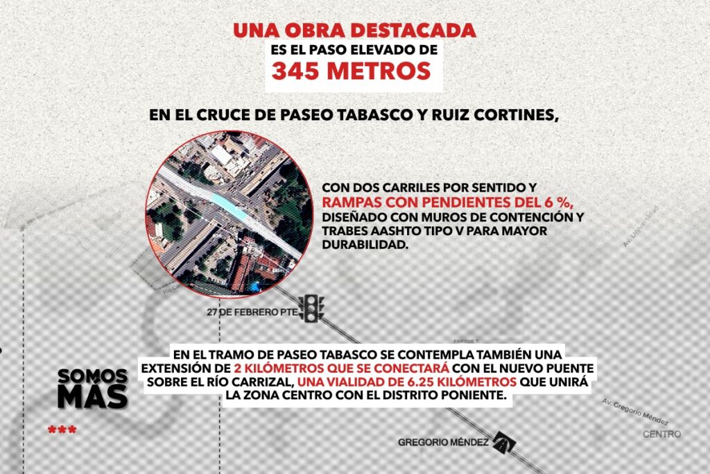 En el tramo de Paseo Tabasco se contempla también una extensión de 2 kilómetros que se conectará con el nuevo puente sobre el río Carrizal, una vialidad de 6.25 kilómetros que unirá la zona centro con el Distrito Poniente. Este corredor servirá como eje vertebral del nuevo sistema, facilitando la conexión entre zonas habitacionales, comerciales y administrativas.