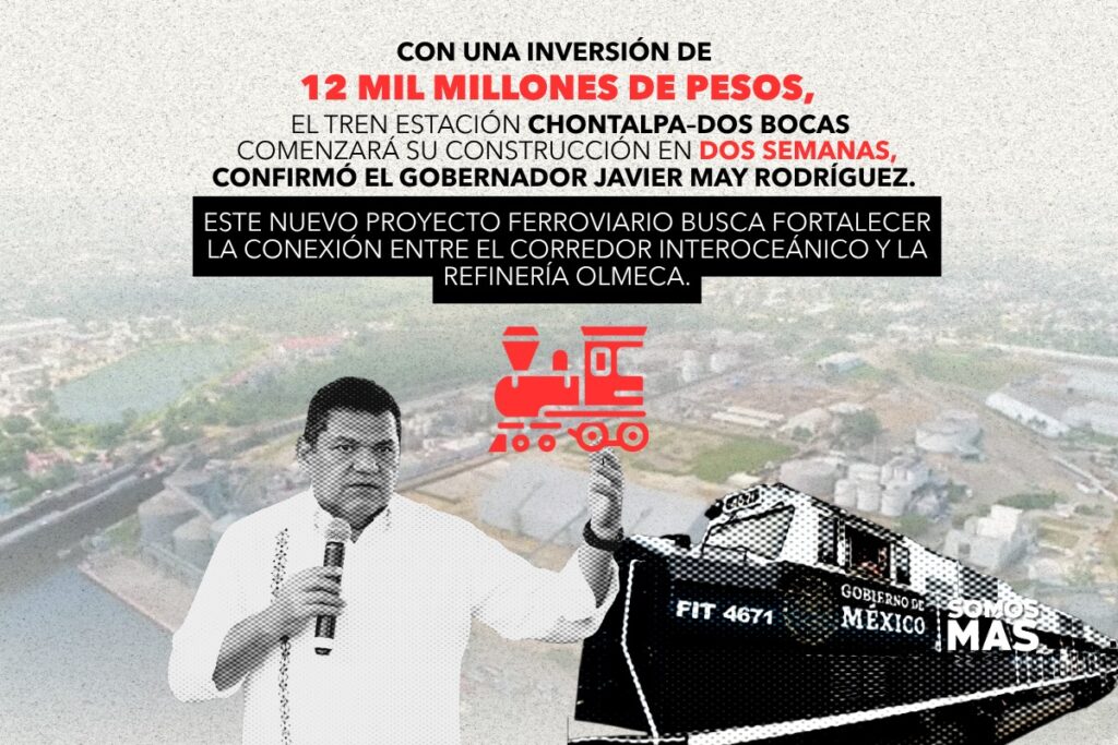 Con una inversión de 12 mil millones de pesos, el Tren Estación Chontalpa–Dos Bocas comenzará su construcción en dos semanas, confirmó el gobernador Javier May Rodríguez. Este nuevo proyecto ferroviario busca fortalecer la conexión entre el Corredor Interoceánico y la Refinería Olmeca.