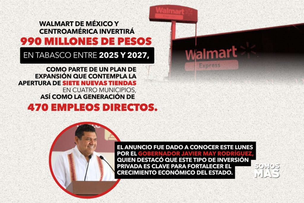 Walmart de México y Centroamérica invertirá 990 millones de pesos en Tabasco entre 2025 y 2027, como parte de un plan de expansión que contempla la apertura de siete nuevas tiendas en cuatro municipios, así como la generación de 470 empleos directos.