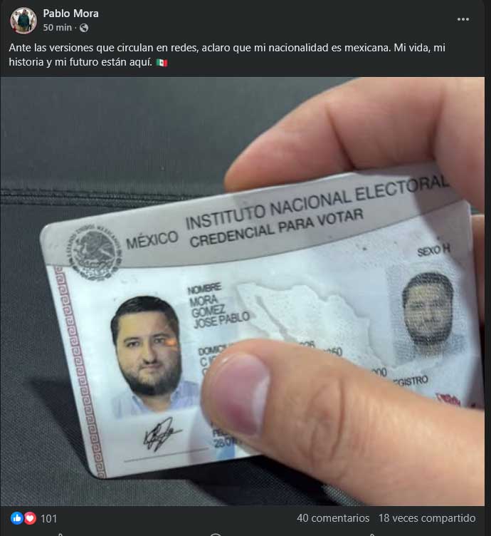 Ante las versiones de la oposición sobre la nacionalidad del subsecretario de Gobierno de Tabasco, José Pablo Mora Gómez, el funcionario emitió una respuesta a través de sus redes sociales. Luego de la queja presentada por el PRD ante el Instituto Electoral y de Participación Ciudadana de Tabasco (IEPCT), Mora Gómez compartió una fotografía de su credencial de elector (INE) para acreditar su estatus legal en el país.