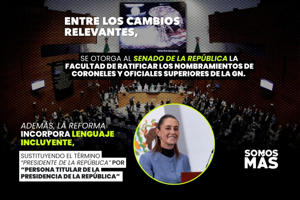 Entre los cambios relevantes, se otorga al Senado de la República la facultad de ratificar los nombramientos de coroneles y oficiales superiores de la GN. Además, la reforma incorpora lenguaje incluyente, sustituyendo el término “presidente de la República” por “persona titular de la Presidencia de la República” y visibilizando el género femenino en las atribuciones de dicho cargo, como parte de un avance hacia la igualdad de trato y oportunidades entre mujeres y hombres.