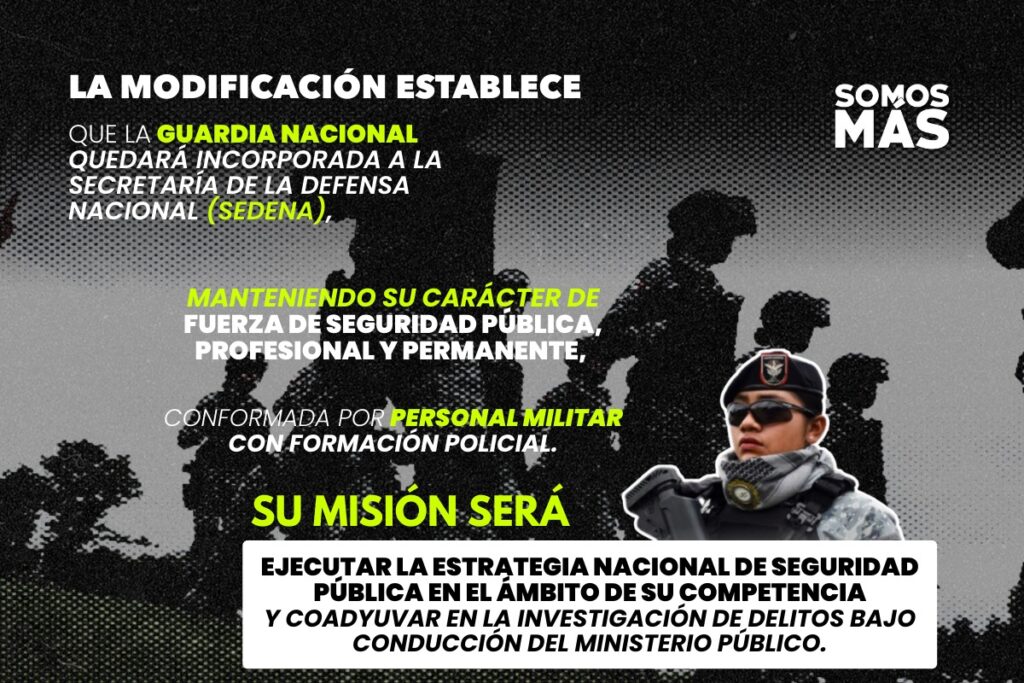 La modificación establece que la Guardia Nacional quedará incorporada a la Secretaría de la Defensa Nacional (Sedena), manteniendo su carácter de fuerza de seguridad pública, profesional y permanente, conformada por personal militar con formación policial. Su misión será ejecutar la Estrategia Nacional de Seguridad Pública en el ámbito de su competencia y coadyuvar en la investigación de delitos bajo conducción del Ministerio Público.
