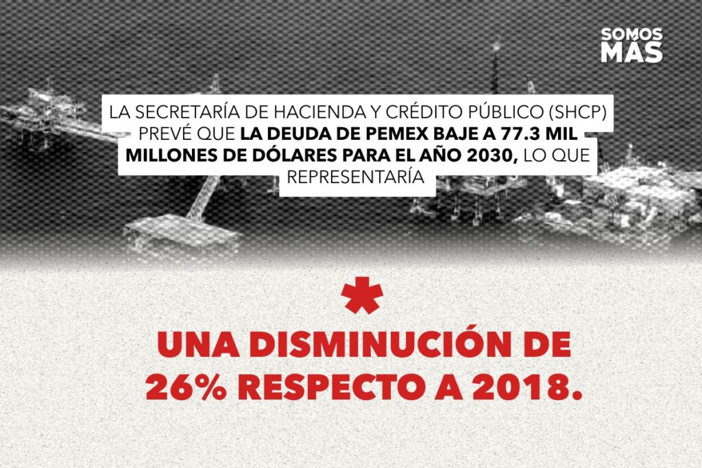 La Secretaría de Hacienda y Crédito Público (SHCP) prevé que la deuda de Pemex baje a 77.3 mil millones de dólares para el año 2030, lo que representaría una disminución de 26% respecto a 2018.