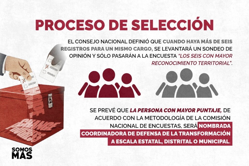 Se prevé que la persona con mayor puntaje, de acuerdo con la metodología de la Comisión Nacional de Encuestas, será nombrada coordinadora de defensa de la transformación a escala estatal, distrital o municipal.