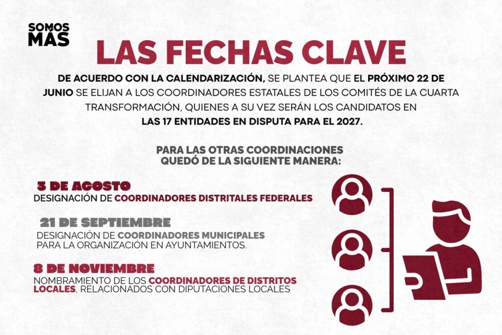 De acuerdo con la calendarización, se plantea que el próximo 22 de junio se elijan a los coordinadores estatales de los Comités de la Cuarta Transformación, quienes a su vez serán los candidatos en las 17 entidades en disputa para el 2027.
