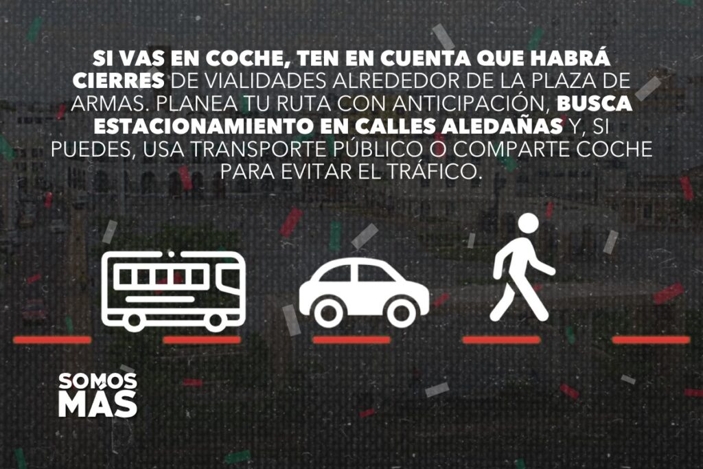 Si vas en coche, ten en cuenta que habrá cierres de vialidades alrededor de la Plaza de Armas. Planea tu ruta con anticipación, busca estacionamiento en calles aledañas y, si puedes, usa transporte público o comparte coche para evitar el tráfico.