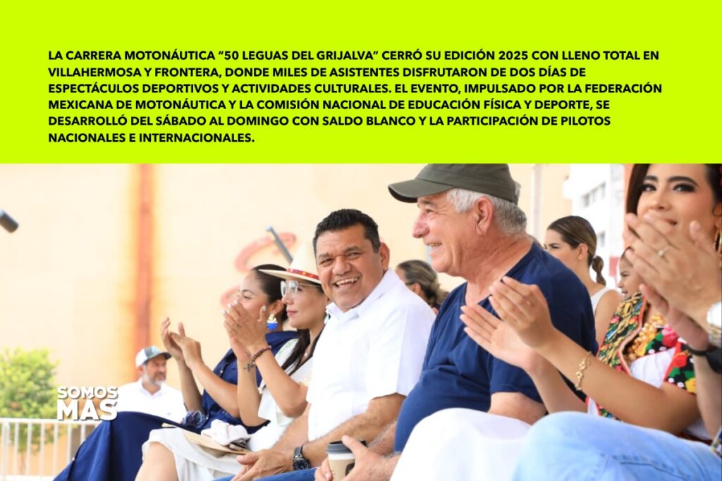 La Carrera Motonáutica “50 Leguas del Grijalva” cerró su edición 2025 con lleno total en Villahermosa y Frontera, donde miles de asistentes disfrutaron de dos días de espectáculos deportivos y actividades culturales. El evento, impulsado por la Federación Mexicana de Motonáutica y la Comisión Nacional de Educación Física y Deporte, se desarrolló del sábado al domingo con saldo blanco y la participación de pilotos nacionales e internacionales.