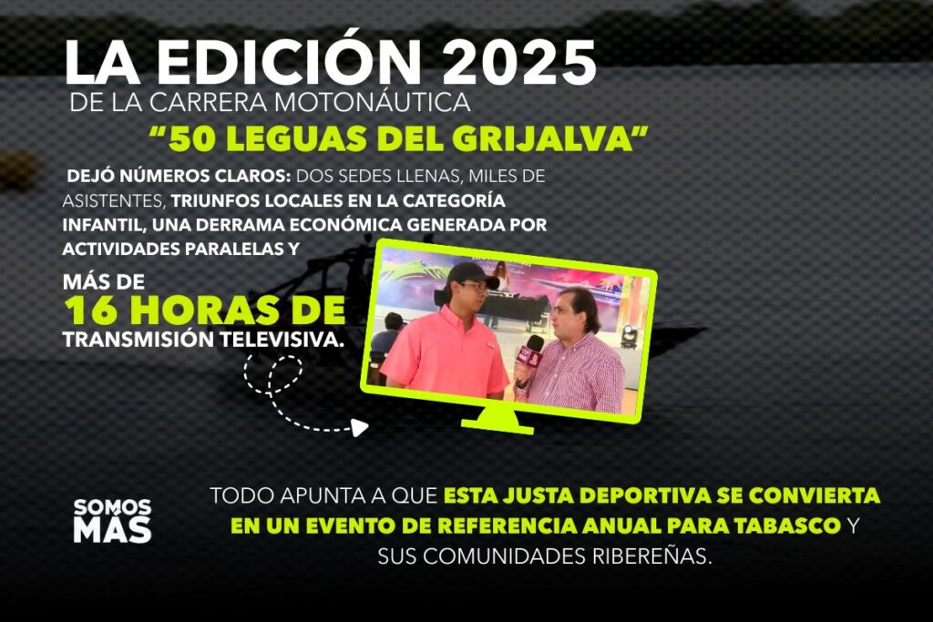 La edición 2025 de la Carrera Motonáutica “50 Leguas del Grijalva” dejó números claros: dos sedes llenas, miles de asistentes, triunfos locales en la categoría infantil, una derrama económica generada por actividades paralelas y más de 16 horas de transmisión televisiva. Todo apunta a que esta justa deportiva se convierta en un evento de referencia anual para Tabasco y sus comunidades ribereñas.