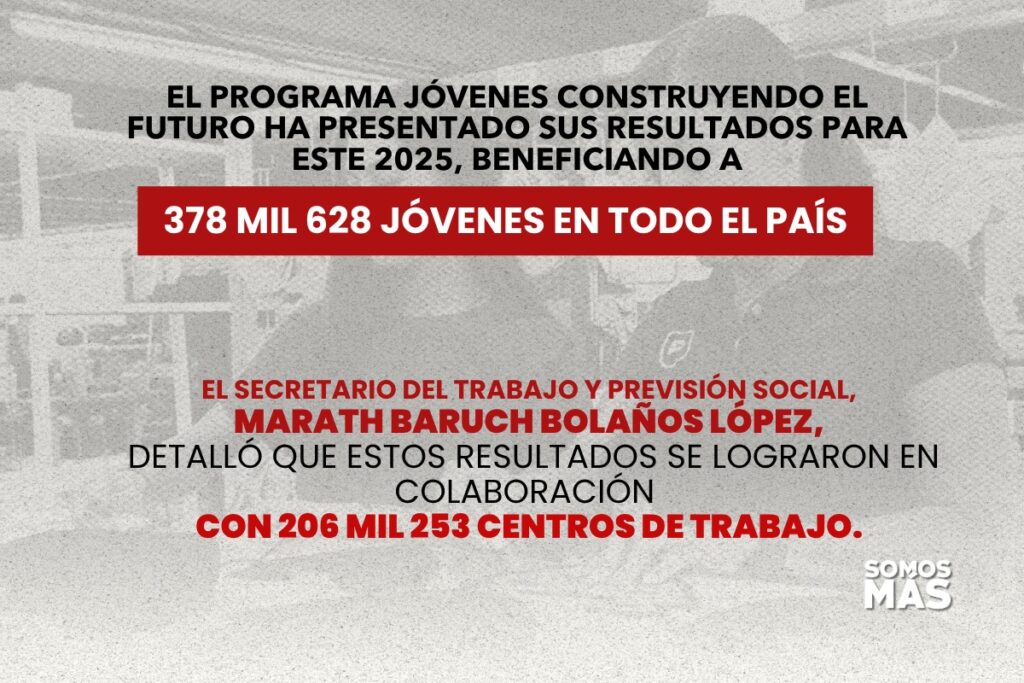 El programa Jóvenes Construyendo el Futuro ha presentado sus resultados para este 2025, beneficiando a 378 mil 628 jóvenes en todo el país. El secretario del Trabajo y Previsión Social, Marath Baruch Bolaños López, detalló que estos resultados se lograron en colaboración con 206 mil 253 centros de trabajo. La iniciativa busca ofrecer oportunidades a jóvenes que no estudian ni tienen un empleo, reafirmando su compromiso con la inclusión laboral y el desarrollo de nuevas generaciones.