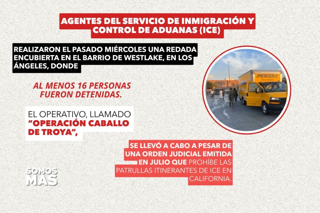Agentes del Servicio de Inmigración y Control de Aduanas (ICE) realizaron el pasado miércoles una redada encubierta en el barrio de Westlake, en Los Ángeles, donde al menos 16 personas fueron detenidas. El operativo, llamado “Operación Caballo de Troya”, se llevó a cabo a pesar de una orden judicial emitida en julio que prohíbe las patrullas itinerantes de ICE en California.