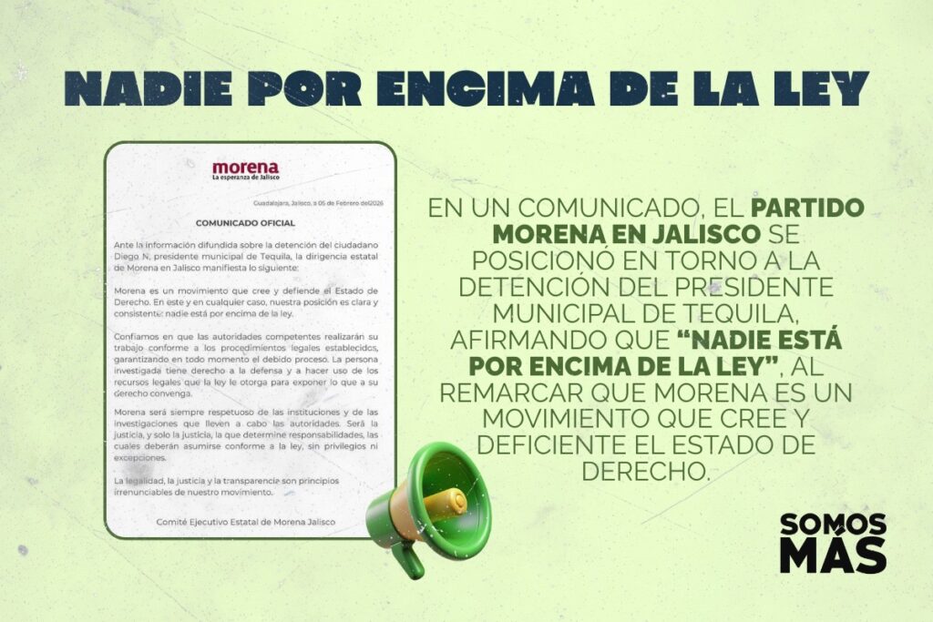 En un comunicado, el partido Morena en Jalisco se posicionó en torno a la detención del presidente municipal de Tequila, afirmando que “nadie está por encima de la ley”, al remarcar que Morena es un movimiento que cree y deficiente el Estado de Derecho.