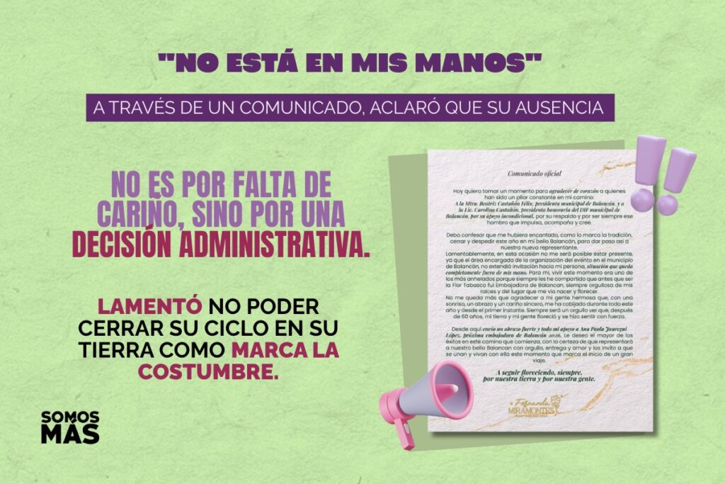 A través de un comunicado, Fernanda aclaró a sus seguidores que su ausencia en la presentación oficial de la nueva embajadora no se debe a falta de cariño por su pueblo. Lamentó no poder despedirse de su gente en su propia tierra como marca la tradición, señalando que fue una decisión administrativa la que la dejó fuera.