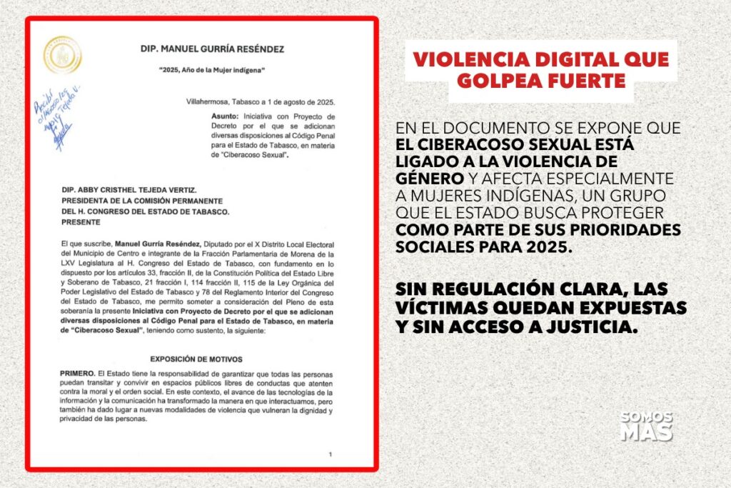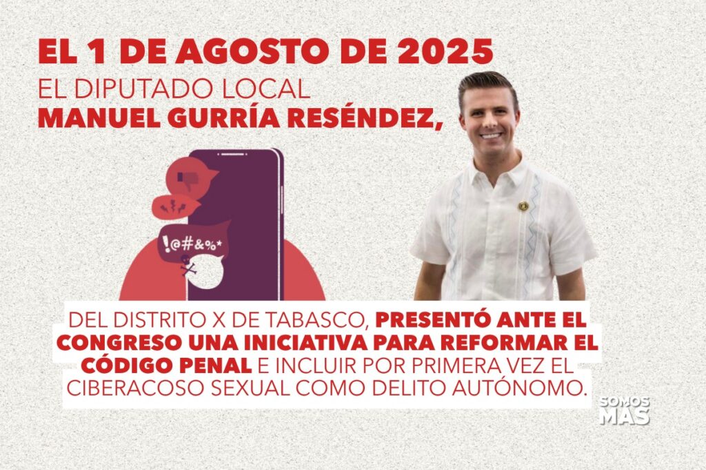 El 1 de agosto de 2025, el diputado local Manuel Gurría Reséndez, del Distrito X de Tabasco, presentó ante el Congreso una iniciativa para reformar el Código Penal e incluir por primera vez el ciberacoso sexual como delito autónomo. Esta propuesta busca sancionar explícitamente esta forma de violencia digital que afecta sobre todo a mujeres y menores, y que hoy no está contemplada en la ley estatal.