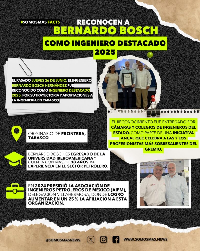 El pasado jueves 26 de junio, el ingeniero Bernardo Bosch Hernández fue reconocido como Ingeniero Destacado 2025, por su trayectoria y aportaciones a la ingeniería en Tabasco.
