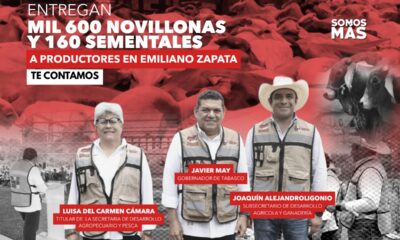 Este martes 5 de agosto se entregaron mil 600 novillonas y 160 sementales a pequeños productores de 11 comunidades de Emiliano Zapata, como parte del programa...